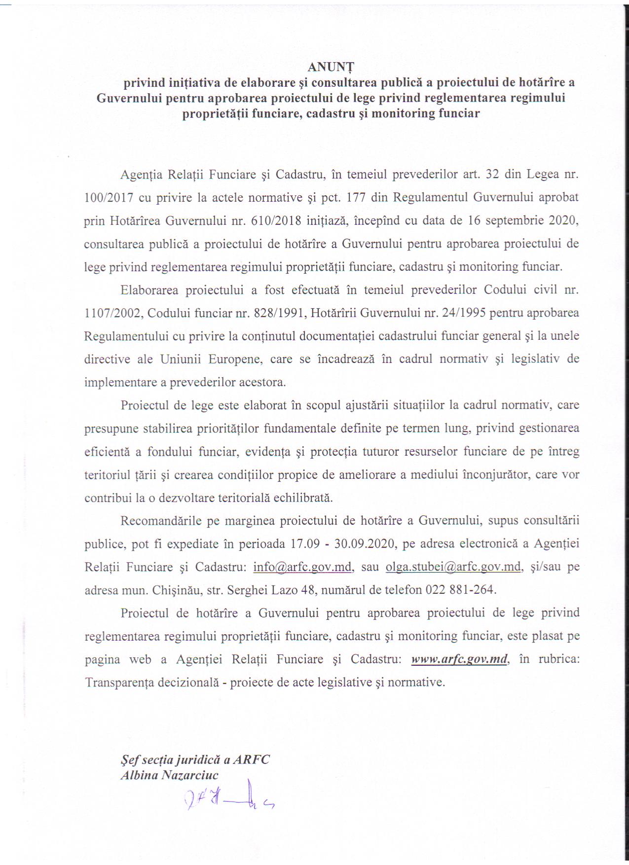 - 16.09.2020 Anunț privind inițiativa de elaborare și consultare publică a proiectului de hotărâre a Guvernului pentru aprobarea proiectului de lege privind reglementarea regimului proprietății funciare, cadastru și monitoring funciar.